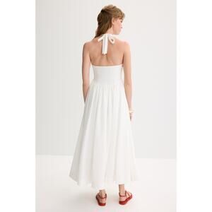 Materials and Measurements White (100% Nylon). Casual dress. Halter neck. Sleeveless. Tie closure. Shoulder to hemline: 53". Imported.