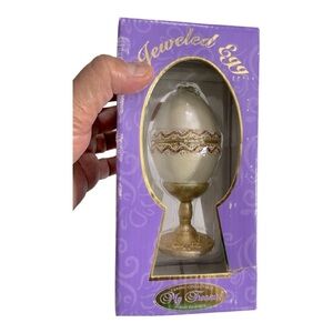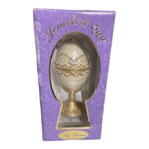 New in box. I just opened to take pictures. Classic Collectible My Treasure Jeweled Egg. Light cream in color, trimmed in white and gold lace detail, with rhinestones .The egg opens and is lined with white satin. The pedestal that the egg sits on top is painted with gold shimmer. It can be used to hold your favorite piece of jewelry, like a ring, bracelet, earrings.