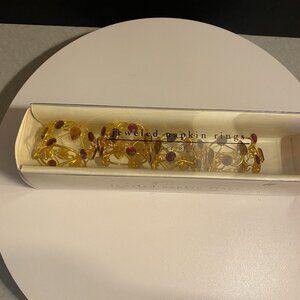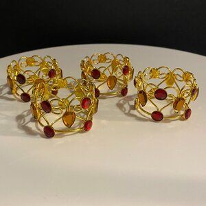 Elegant set of 4 jeweled napkin rings featuring gold-toned metal with red and amber faceted gems. These add a royal touch to any table setting — perfect for holidays, dinner parties, or special occasions.