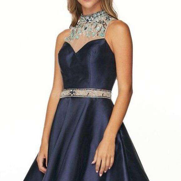 Style: Jeweled Halter Neckline, A-Line Silhouette, Short, Open Back