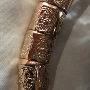 Exquisite Jewel Handbag. Two zippers allow access to the inside compartment with a small pocket on the one end. It’s 8 inches wide, and 24 inches around. The handle has metal pieces on it and a detachable adjustable shoulder strap. Beautiful bronze color. Perfect for the upcoming holiday season.