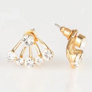 A dazzling pair of Paparazzi Earrings in Gold, the Jeweled Jubilee design features a solitaire white rhinestone attached to a double-sided post for a unique look. Adorned with glassy white rhinestones, these earrings radiate elegance with an edgy twist. Perfect for any occasion, these earrings attach to a standard post fitting.