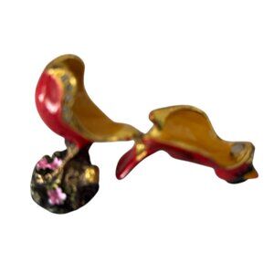 This charming red cardinal trinket box is a delightful blend of functionality and artistry. Adorned with sparkling rhinestones and perched on a floral base, it doubles as a decorative keepsake and storage for small treasures. The hinged design adds convenience while the vibrant colors bring life to any display.