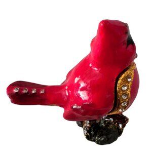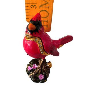 Jeweled Red Cardinal Trinket Box With Rhinestones & Floral Base