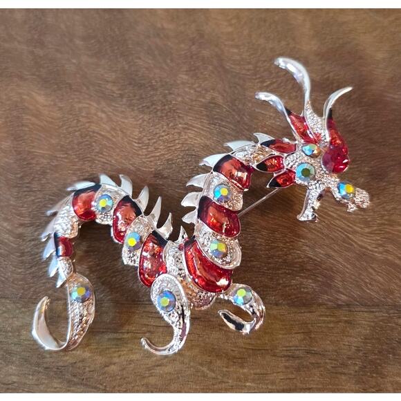 Jeweled Red Gold Dragon Chinese Spring Festival Brooch Pin 3 1/2"