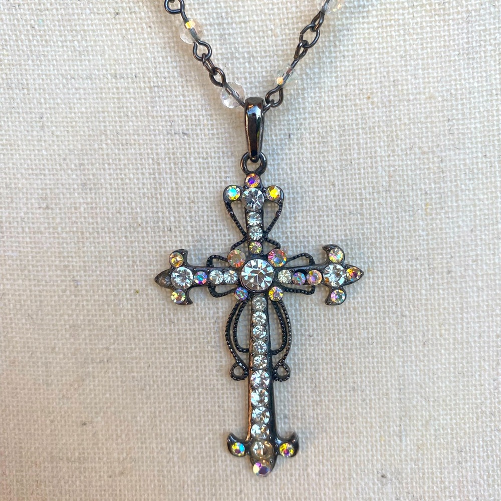 This beautiful jeweled cross has a hematite setting, showcasing the crystal and crystal AB stones. Beautiful Crystal AB beads make up the “chain” and gives it a rosary effect. The length of necklace is 18.5” plus a 3” extender.