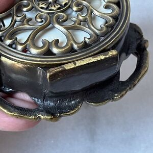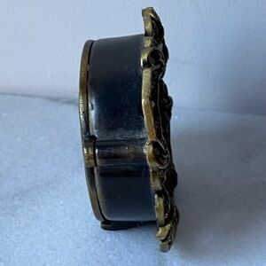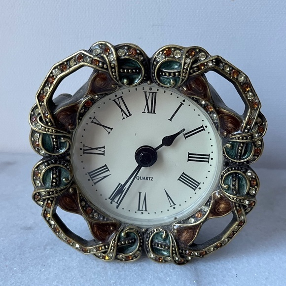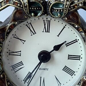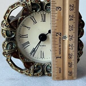 Jeweled Circle Face Battery Operated Quartz Tabletop Clock. Made in China. Requires 1 AAA Battery (not included). Tested and Works. Magnetic Back Closure closes secure. Front has a 4" diameter. Weight 11.1 oz. This clock is brass toned with emerald green and gold brown enamel paint. It has stones and In excellent condition with all stones present and secure in settings. There is no chips, cracks and no scratches on enamel paint. Please review photos for they are part of the description.