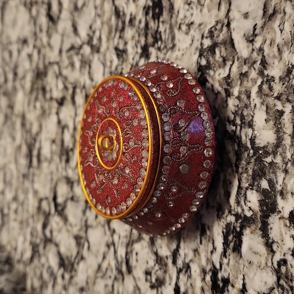Beautiful jeweled red container is just over 3 inches wide 1 1/2" tall. Lid opens up and area to store is 2 1/4" wide 3/4" tall. Red silver and gold.