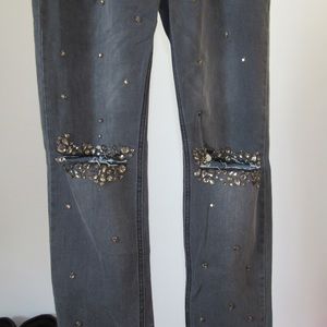 Super cute jeweled jeans heavily jeweled around the knee. Material is cotton, polyester, spandex so has good amount of stretch. Dry clean only (but 99% sure I machine washed before and they’re fine). Color is a dark charcoal gray