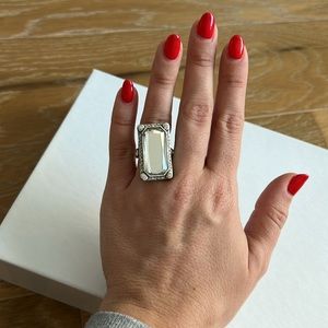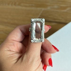 Silver ring with jeweled and rhinestone accents. Size 6 from Lia Sophia. An inch and a quarter long and 3/4 of an inch wide design.