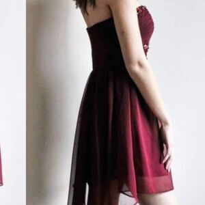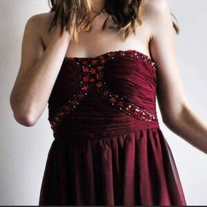 Jeweled Strapless Cocktail/Party Dress. Features jewels along the bodice in burgundy shade. Hi Low style and very flattering on. Side zipper closure. Pics on mannequin and with measuring tape are size M.