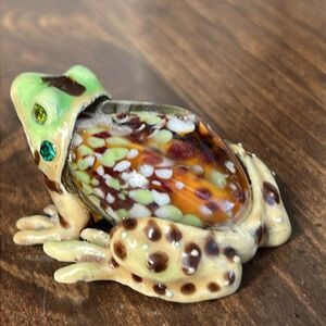 Beautifully detailed appears to be a decorative solid stone, set into a metal frog with stones inset in the metal