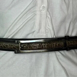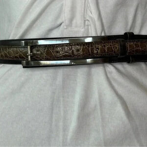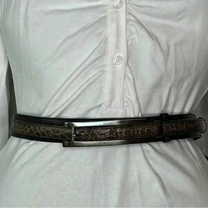 Stunning designer belt, crafted from high-quality leather. This timeless piece features a unique animal print pattern in brown. The skinny belt width and adjustable buckle make it a versatile accessory. This wearable art belt is perfect for those who love designer, American, and Bohemian styles. The buckle accents and classic retro design add a touch of preppy charm to any outfit.