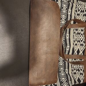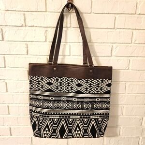 Stylish and versatile tote bag featuring a striking black and white pattern with brown accents. Perfect for everyday use. Rio Weave approximately 13.5x14. Also reversible.