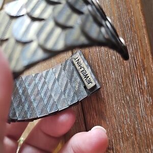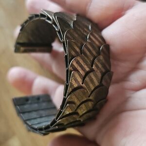 Stylish brass/brown cuff bracelet. Features a unique textured design. Perfect for any occasion.