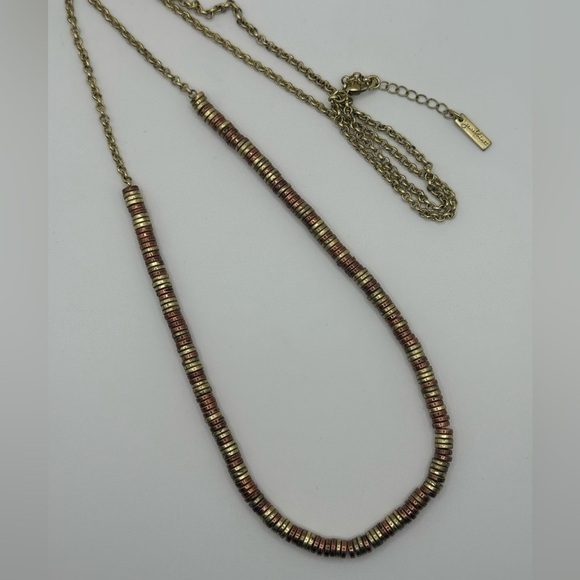 Stylish vintage necklace featuring stacked flat disc beads in warm metallic tones of gold, copper, and bronze, strung along a sturdy gold-toned chain. The earthy yet elegant design gives it a unique retro vibe, perfect for layering or wearing as a statement piece. Lightweight and versatile, this necklace easily transitions from casual to dressy looks. A great addition to any jewelry collection