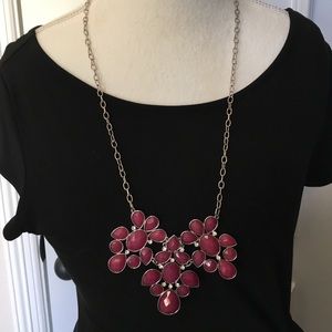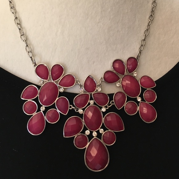 Acrylic hot pink jewels and crystals on silver necklace. Double lobster claw clasps for ultimate versatility in length!