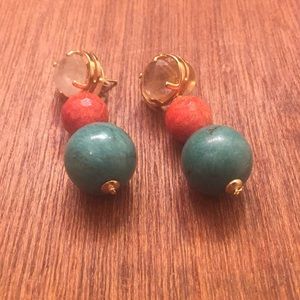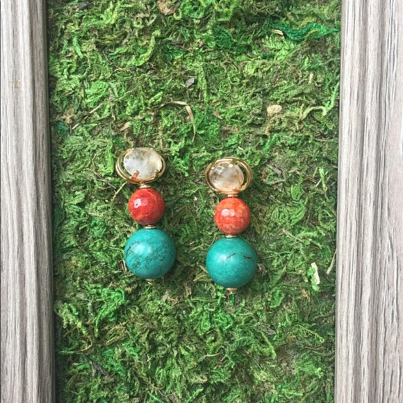 Semi precious gold earrings with green and red faceted quartz, and rutilated stone