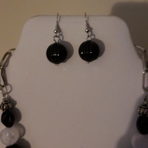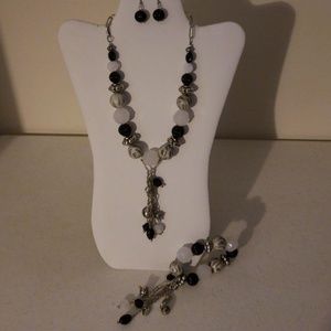 Black and white 4 PC set necklace, 2 earrings with charm bracelet