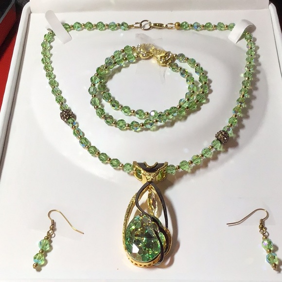 Totally made with Swarovski Crystals of a peridot green. In between each crystal are gold spacers with 2 black pave balls with gold rhinestones. Set includes Necklace, bracelet, and earrings. Notice that the focal piece is gold and black and a clear crystal.