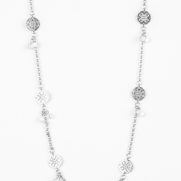 Silver necklace with white beads and silver charms and matching earrings. Lead and nickel free. Will ship for a flat rate of $4 in the US
