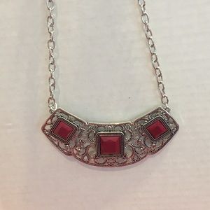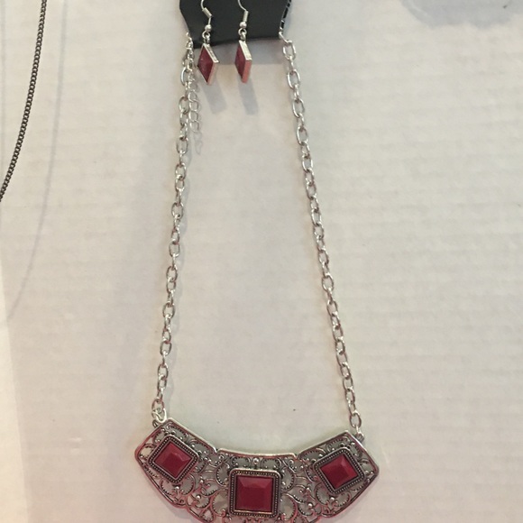 Sliver and dark red crackle stone short necklace with earrings zoom in to see the detail