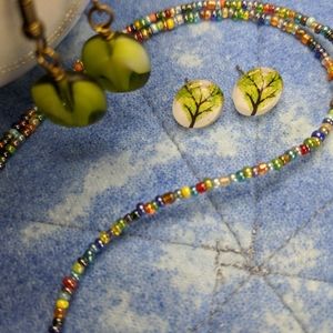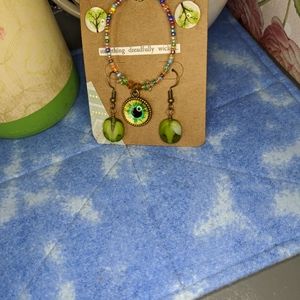 Eye pendant necklace with dangling glass earrings and a sterling silver stud picture earring set. Free mystery gift with each purchase.โค๏ธ๐โฅ๏ธ๐ All items have been cleaned and sanitized prior to shipping.
