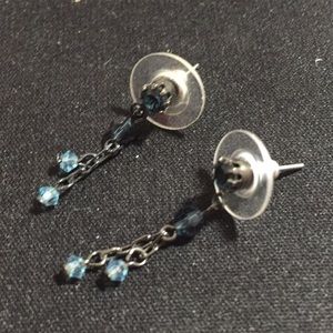 Stunning dark blue stone at base of earring with dark blue and light blue cut beads on a small chain.