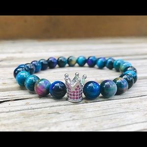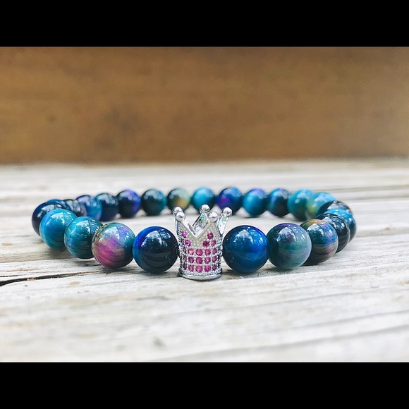 New galaxy color! Natural tiger eye beads, purple, blue, pink 8mm Cz King crown Fucsia beads silver