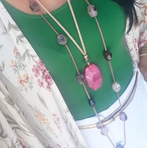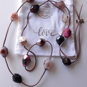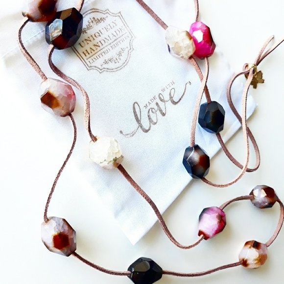 Long Necklace with leather and Agates stones multicolor pink and Black