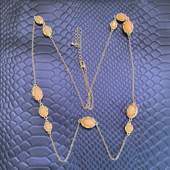 Gold tone with orange oval shaped stones long chain necklace, adjustable