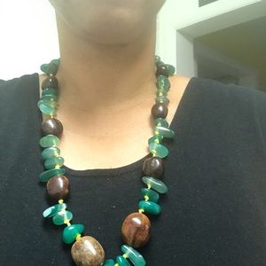 Make second style Africa necklace . There have yellow strings mix green jade stone and seeds nuts . Size 28 inches long.