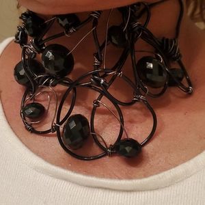 Black aluminum and silver wire with black acrylic stones. This piece can be worn as a bracelet or a choker just by adding a ribbon