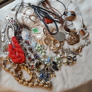 This lot has 23 pieces necklaces, earrings, some sets. Some new, some in good condition, and some are DIY projects.