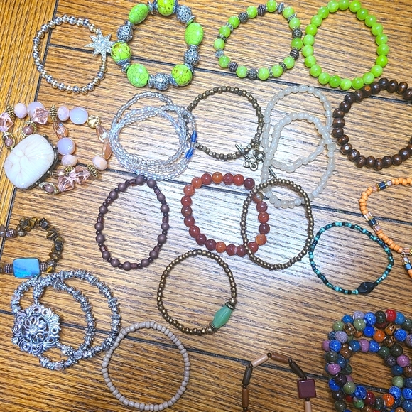 My daughter and my mother started making these. Bracelets, necklaces, earings. Most are made with the clear stretch string; clasp with string glue to hold at the end. The beads vary. We have plenty made but will make to order as well. Made to fit 6 to 8 inch wrist. My daughter has some made for younger girls her age as well. Depending on the item the price varies. 6 to 8 dollars PER item. Not for all in the picture