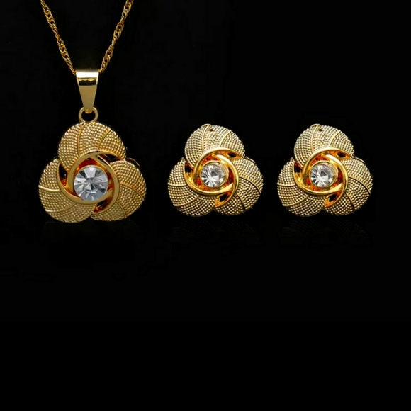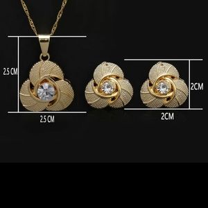 Good quality jewelry set. Comes with earrings, and necklace. Does not tarnish or stain.
