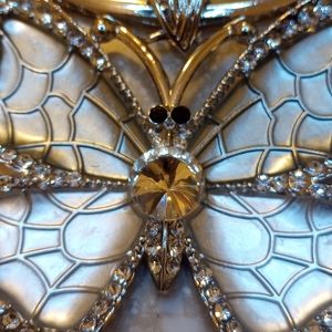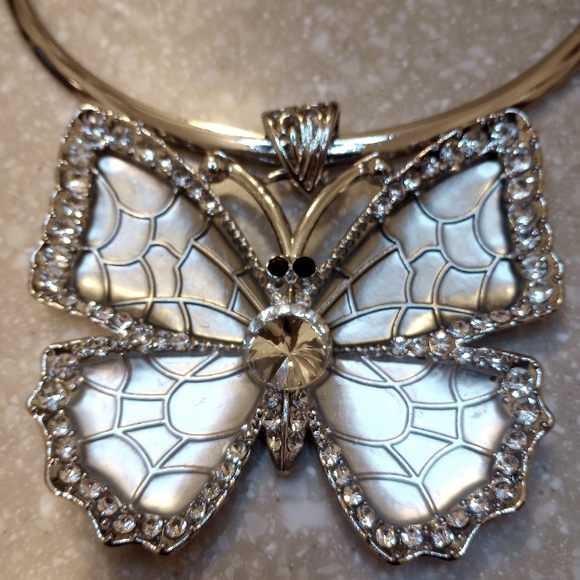 Butterfly silver metal set with matching earrings. The beautiful butterfly have Rhinestones around the sides. Size of pendant 3.5 inches wide.