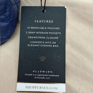 New with tags PurseN travel jewelry bag. Features 10 removable jewelry pouches, 2 snap pockets, and drawstring closure.