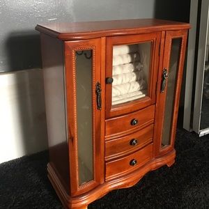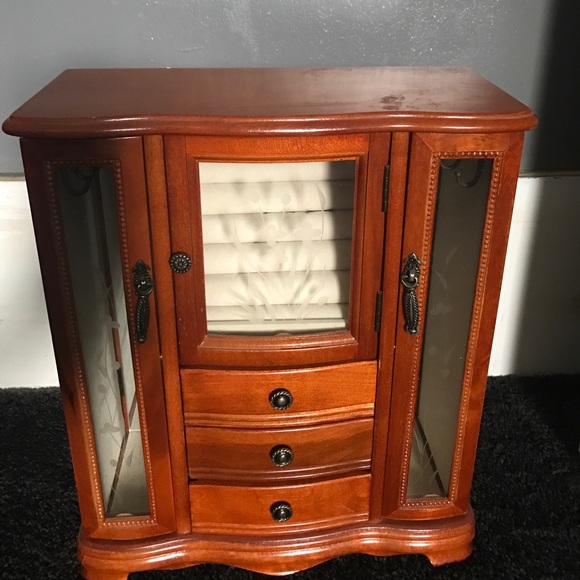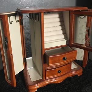 Perfect for holding rings, bracelets, and necklaces and is in perfect condition! Consist of three pull out storage boxes, two side departments to hold chains and necklaces, as well as a section to hold all of your rings safety!