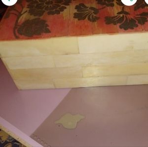 pink white and silver design. open top jewelry box with wooden bottom. and carved genuine bone Made in India. excellent condition