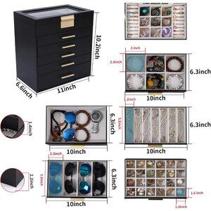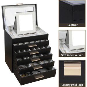 Jewelry Box for Women, Black 6 Layer Large Jewelry Organizer with Glass Lid for