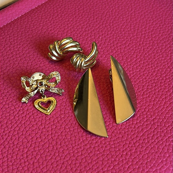 2 pairs of earrings and 1 bow shaped pin with a a dangling heart.
