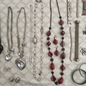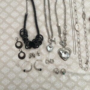 Sparkley and fun jewelry lot + a little makeup! Mostly costume type, pre-loved jewelry, all clean and ready to wear. Necklaces, bracelets, earrings, pins/broaches, rings size 7 and 6 3/4. 1 pair of Silpada earrings.