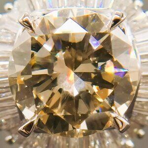 This is an absolutely stunning diamond ring. The center diamond is 2.25cts and the encircling baguette diamonds are over a carat, making this ring almost 3.5 cts of diamonds set in platinum. It is just stunning! The clarity of the center stone is VSI1 and the encircling baguette are VS1-SI2. The center stone is a fancy color with a hint of yellow and peach tones, color L. It is also a unique cut that really provides a deep view into the stone where you can see the incredible color and clarity of the stone. Please see pictures for more details and happy to answer any questions.