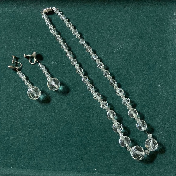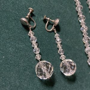 Clear Crystal Beaded Jewelry Set. Beautiful design picks up any color of clothes you wear resulting in a beautiful match. Earrings are screwback and are 2in long. Necklace is 7.5” long. No scrapes or messed up to crystals
