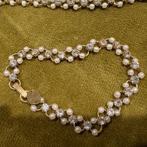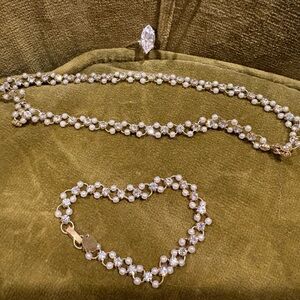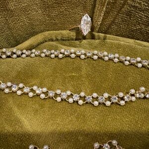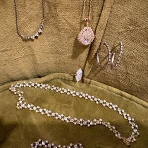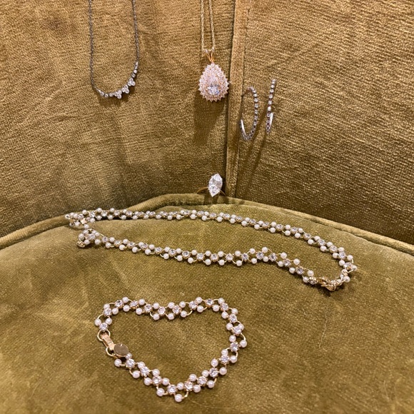 Includes one pendant necklace, one choker like necklace with matching bracelets - mix of pearls and cubic zirconia, one simply classic necklace, one ring - size 7, and hoop earrings