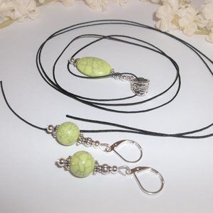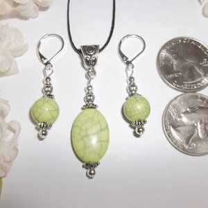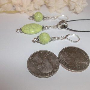 Brand new & handmade by me - wvluckygirl. Done with pretty green acrylic beads and antiqued silver toned costume jewelry beads. Earrings dangle & drop from 925 sterling silver lever backs for women's pierced ears. Pair of earrings measure 1 3/4 inches tall & 3/8 inch wide. Each single earring weighs 1.6 grams. Lightweight! Pendant charm and decorative bail measure 2 inches tall & 1/2 inch wide. Pendant is removable. It slides onto a 36 inch black braided nylon cord rope string. Great gift idea!