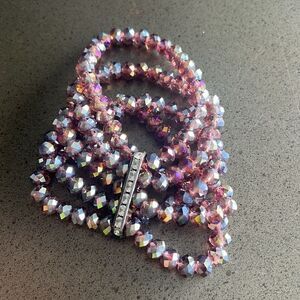 - There is a coiled bracelet consisting of multiple strands of small, round crystals