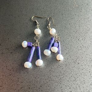 - The earrings are drop-style, featuring a combination of purple beads and pearl-like beads.