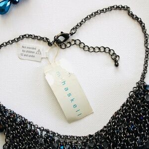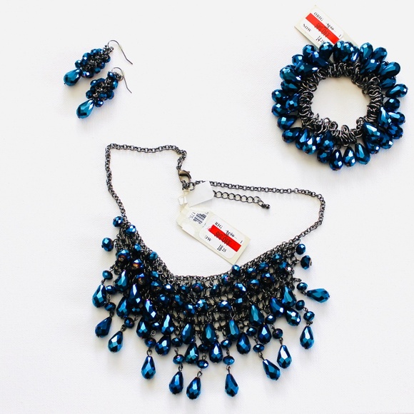 This very lovely set of necklace, stretch bracelet, and fish hook pierced earrings is new with tags. It was purchased by my mother who worked at Macy’s jewelry counter. She loved jewelry that was bold and colorful. This set has a Boho vibe with blue crystal drops and gunmetal tone rings in chainmail style. The necklace has a lobster clasp closure and it measures 20” long. The bracelet is stretch style it measures 3” across and with stretch, up to 9”. The earrings come with a set of plastic nuts to prevent them from loss. They measure 1 7/8” long.